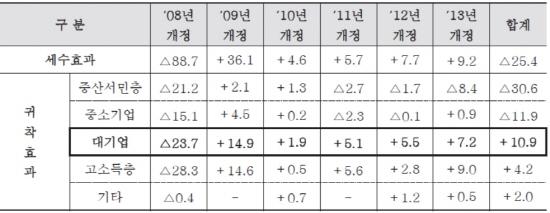 위 도표의 수치는 2008년 이후 세법개정의 세수효과에 대하여 5년간 누적해서 2014년 10월 기준으로 산출한 것이다.