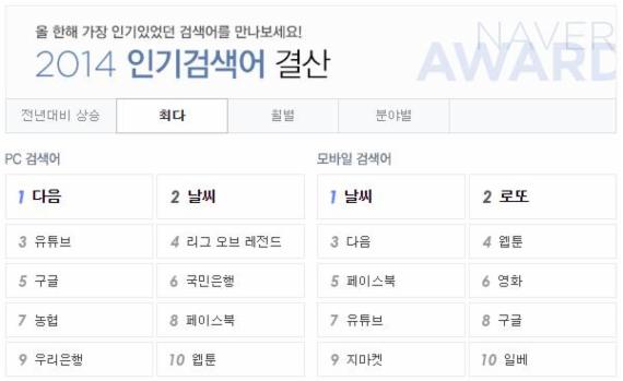모바일 검색어의 경우 2014 최다 인기검색어 1위는 '날씨'였다. 이어 '로또' '다음' '웹툰' '페이스북' 등의 순으로 드러났다.