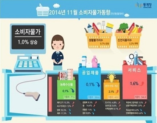 해당 자료에 따르면 전년동월대비 소비자물가 상승률은 지난 5월·6월 1.7%이후 계속 하락 추세를 보이다 지난 10월 1.2%로 반짝 상승 곡선을 그렸지만 지난달에 1.0%로 다시 내렸다.