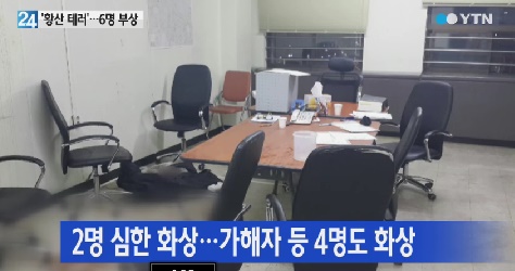 이들은 현재 인근 아주대병원으로 옮겨져 치료받고 있다. 서씨도 이 물질을 뿌리면서 손을 다쳤지만 부상 정도가 가벼워 응급치료만 받고 검찰에서 조사를 받고 있다.