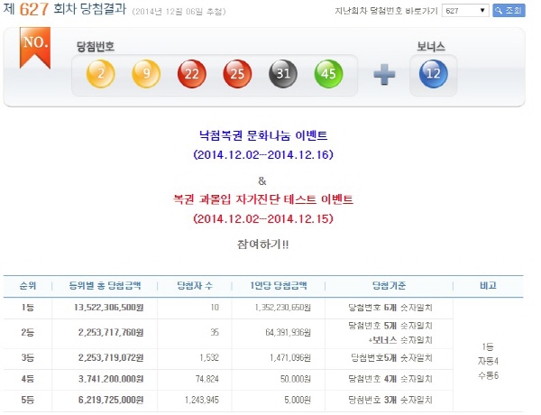 6일 제627회 나눔로또 추첨 결과 '2·9·22·25·31·45'번이 1등 당첨번호로 결정됐다.