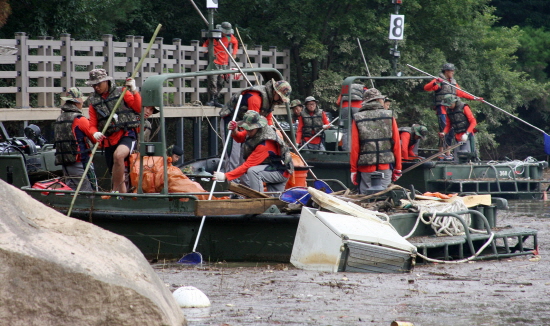 | ▲ 부산 금정구 회동수원지에서 육군 53사단과 7공병여단 도하대대, 특전사 등이 지난 달 집중호우에 때 떠내려온 부유물 제거작업을 하며 구슬땀을 흘리고 있다. /뉴시스 |