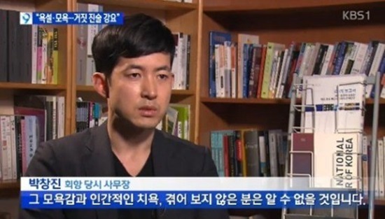 박창진 대한항공 사무장은 12일 KBS1 ‘9시 뉴스’와의 인터뷰에서 “땅콩을 제공하려던 여승무원을 대신해 기내 서비스 책임자인 내가 용서를 구했지만 조현아 전 부사장이 심한 욕설을 하며 매뉴얼 내용이 담겨있는 케이스 모서리로 손등을 수차례 찍었다”고 증언했다.