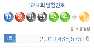 20일 제629회 나눔로또 추첨 결과 '19, 28, 31, 38, 43, 44'가 1등 당첨번호로 결정됐다. 2등 보너스 번호는 '1'이다.