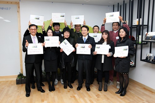 | ▲ 남 지사와 간담회 참석자들이 자신들의 소망을 적은 스케치북을 들고 기념촬영하고 있다. |