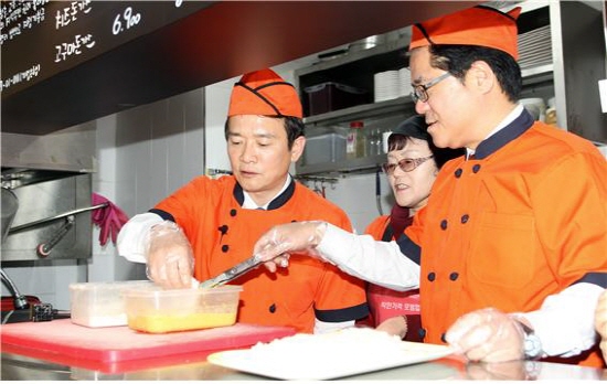 | ▲ 21일 오후 수원 조원시장 내 사회적협동조합 마돈나돈가스에서 남경필 경기도지사와 이기우 경기도 사회통합부지사가 돈가스 만들기 체험을 하고 있다. |