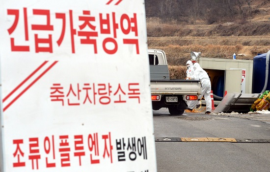 | ▲ 전국적으로 구제역과 조류인플루엔자(AI)가 확산되고 있는 가운데 19일 오후 충남 공주시 유구읍 한 농장 앞에서 방역 관계자들이 방역을 실시하고 있다. /사진=뉴시스 |