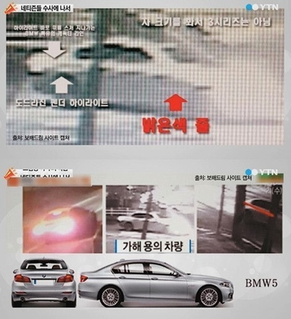 경찰은 사고직후 주변 CCTV 50여개를 분석, 하얀색 BMW5 승용차가 용의차량일 가능성이 큰 것으로 보고 수리업체 등을 대상으로 이 차량의 행방을 찾고 있다.