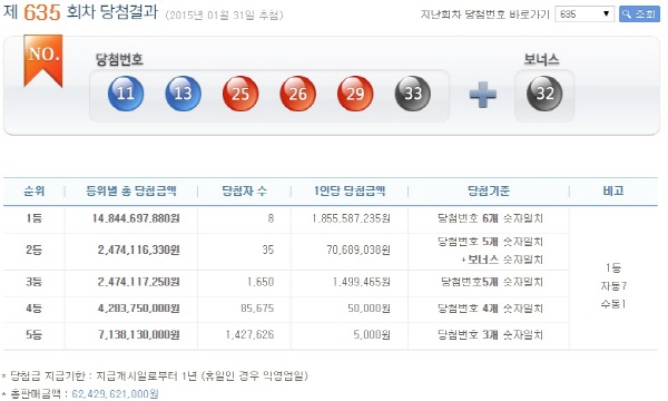 31일 제635회 나눔로또 추첨 결과 '11, 13, 25, 26, 29, 33'이 1등 당첨번호가 됐다. 2등 보너스 번호는 '32'로 결정됐다.