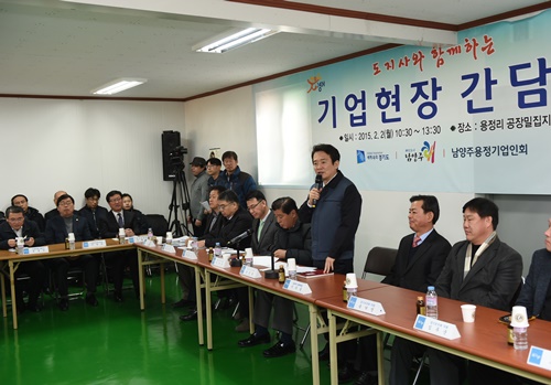 [미디어펜=이상일기자]기업인들의 애로사항을 청취하고 해결방안을 함께 고민하기 위해 현장 행정에 나선 남경필 경기도지사가 남양주시 용정리 공장밀집지역 진입로 확장문제 해결에 최선을 다하겠다고 밝혔다.