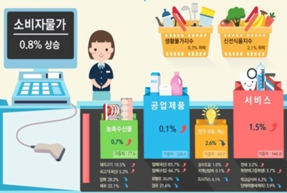 [미디어펜=이상일 기자] 지난달 소비자물가 상승률이 0.8%로 지난해 12월에 이어 2개월 연속 0%대를 기록해 네티즌들의 눈길을 끌고 있다.