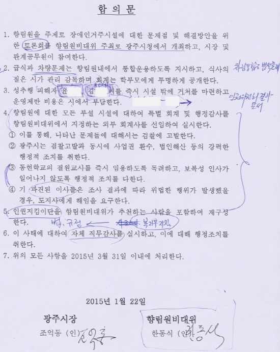 새벽 1시 경 조억동 광주시장이 비대위와 더불어 서명한 합의문을 살펴보면 의아하다.