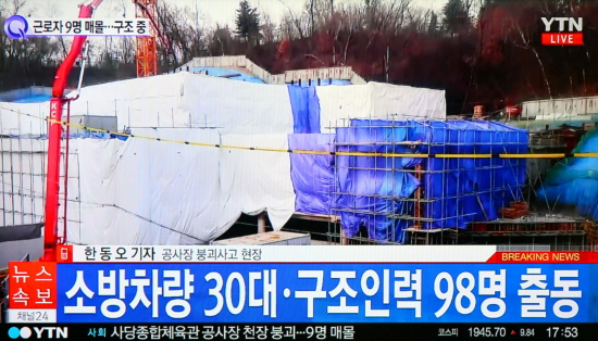 | ▲ 11일 오후 4시 53분께 서울 동작구 사당종합체육관 신축공사장에서 천장 일부가 무너져 작업자들이 매돌되는 사고가 발생했다. /YTN 캡쳐 |