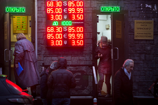 ▲ 2014년 12월 16일(현지시간) 러시아 모스크바에서 시민들이 환전소에서 루블화를 달러로 바꾸려 줄지어 서 있다. 루블화는 이날 러시아 중앙은행의 금리 인상에도 불구하고 가치가 20% 떨어졌다. /사진=뉴시스 |