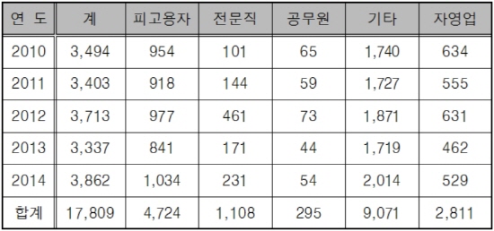 ▲ 간통죄 혐의자의 직업별 현황(단위: 명). /자료: 국회의원 김진태, 출처: 경찰청 |