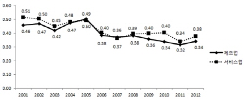 한편 기업규모 간의 이동성을 나타내는 기업이동성 지수도 전반적으로 감소 추이를 보였다. 제조업의 경우 2001년 0.46에서 2012년 0.34로, 서비스업은 2001년 0.51에서 2012년 0.38로 감소했다.