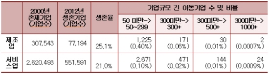 중소기업에서 중견·대기업으로 성장한 사업체수 비율이 매우 낮은 수준에 머무르고 있다. 이번 연구 결과, 300인 미만 중소기업이 1000명 이상 대기업으로 성장한 사업체 비율은 제조업 0.0007%, 서비스업 0.0009%에 불과했다. 또 300인 미만의 중소기업이 300~500인 규모의 중견기업으로 성장한 비율도 제조업 0.06%, 서비스업 0.02%에 불과한 것으로 나타났다. 반면 50인 미만의 사업체가 300인 미만 규모로 성장한 비율은 상대적으로 높은 제조업 0.4%, 서비스업 0.1%로 나타났다.