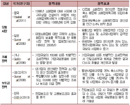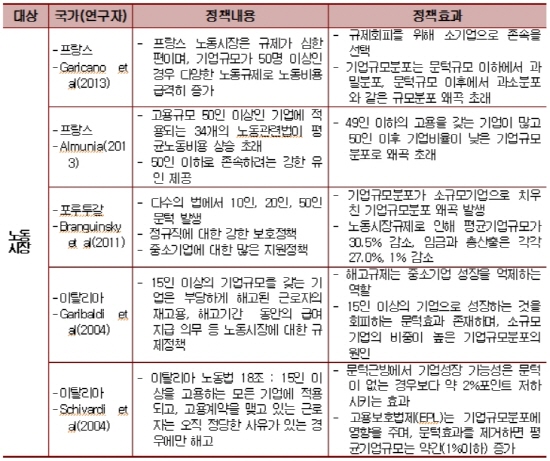 그는 또 “중소기업 지원 제도 역시 실효성을 따져 재편해야 한다”고 덧붙였다. 이 선임연구위원이 보고서에서 밝힌 국내외 규모의존정책의 사례 및 정책효과는 아래 표와 같다. 노동시장, 유통시장, 조세정책, 보조금정책 등의 대상에 따라 해당 사례 및 정책효과를 밝혔다.
