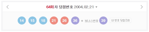 | ▲ 2004년 2월 발표되었던 제64회 나눔로또 1등 당첨번호는 '14, 15, 18, 21, 26, 36'이다. 640회 로또 1등 당첨번호와 맨 끝자리 숫자, 그것도 1만 차이난다. |
