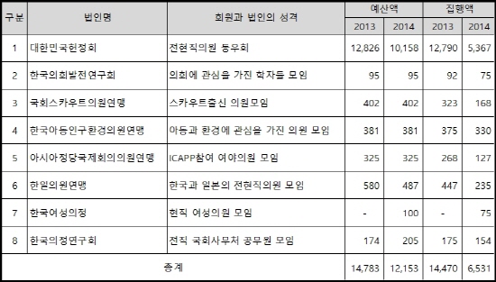 지난 4년간, 8개 법인단체는 연간 140억여원을 지급받았고, 헌정회 연금 개혁으로 2014년부터 121억여 원으로 줄어들었다. 2014년 예산액기준, 대한민국헌정회는 8개 단체 중 최대 액인 101억여 원을 국회로부터 지원받았고, 그 다음으로 한일의원연맹은 4억 8천여만 원, 국회스카우트연맹 4억여 원, 한국아동인구환경의원연맹 3억 8천여원, 아시아정당국제회의의원연맹 3억 2천여 원, 한국의정연구회 2억여 원, 한국여성의정 1억, 한국의회발전연구회 9천 5백여 원 순이다.