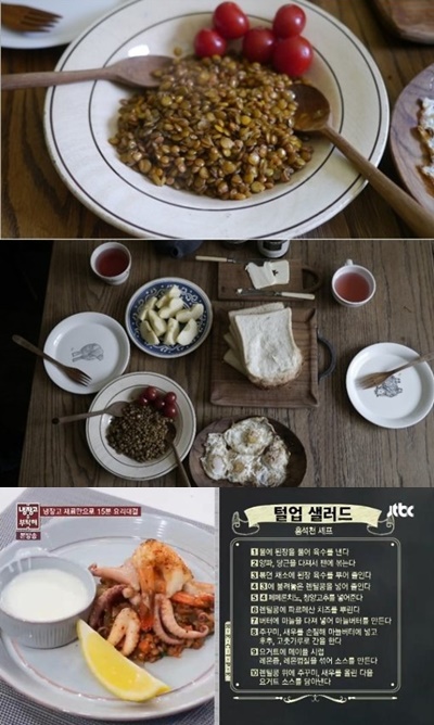 ▲ 가수 이효리가 공개한 렌틸 콩 요리(위, 중간), 방송인 홍석천의 '털업 샐러드' 레시피(아래) / 사진=이효리 블로그, JTBC '냉장고를 부탁해' 방송화면 |