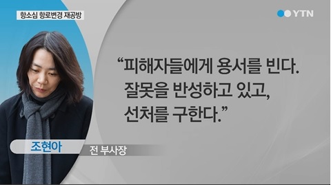 | ▲ 조현아 전 대항항공 부사장이 항소심 공판에 "피해자에게 거듭 사죄하고 용서를 구합니다. 깊이 반성하고 뉘우치고 있습니다"라고 말했다. /사진=YTN 캡처 |