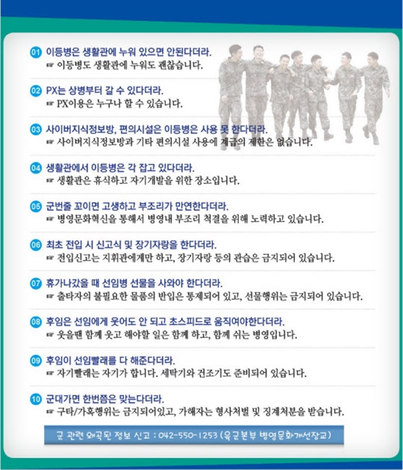 이밖에 ▲사이버지식정보방, 편의시설은 이등병은 사용 못한다 ▲생활관에서 이등병은 각 잡고 있어야 한다 ▲휴가 나갔을 때 선임 선물을 사와야 한다 등 잘못된 정보들에 대해서도 성실히 답변했다. 이들은 모두 사실이 아닌 것으로 전해졌다.