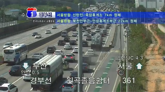 | ▲ 3일간의 연휴의 마지막날인 25일 귀경을 위한 차량들로 오전부터 고속도로 정체가 이어지고 있다.한국도로공사 교통방송 캡처. |