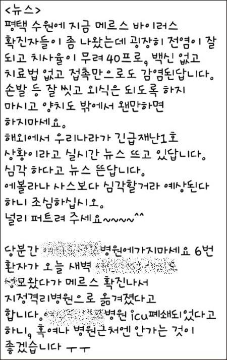 메르스 국내 최초 감염자는 평택의 A병원을 거쳐 수원 B병원으로 갔고, 이후 서울 강남의 대형병원 등을 거쳐 현재는 국가 의료기관에 있으니 근처에 가지 말라는 글도 등장했다.