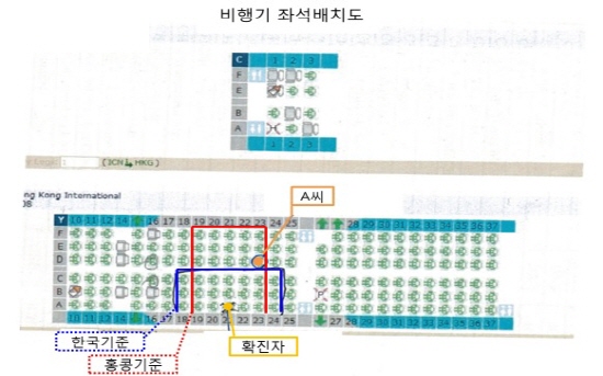 홍콩의 밀접접촉자 기준은 의심자 좌석이 포함된 열과 앞·뒤 2열의 모든 탑승자이다.
