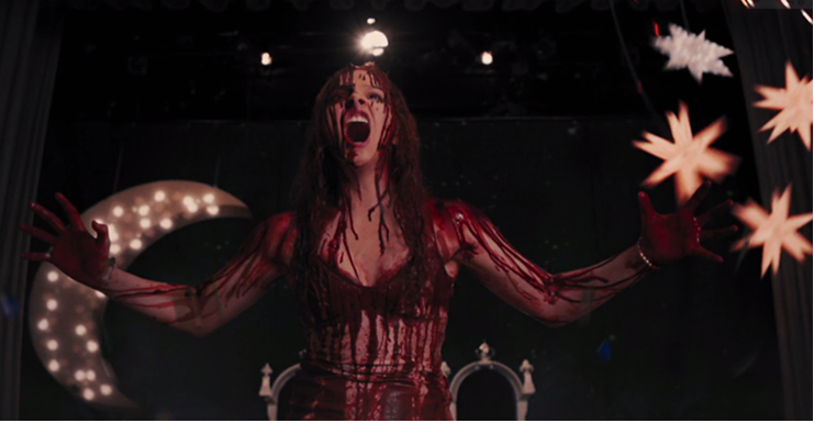 영화 장면을 캡처한 사진 속에서 클로이 모레츠는 친구들이 꾸민 장난으로 돼지피를 뒤집어 쓰는 최악의 상황을 맞이하고 있다.