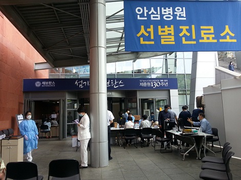 연세세브란스병원은 정문에는 ‘세브란스는 안심병원입니다’라는 문구가 적힌 안내판이 세워져 있었고 발열·기침 등의 증상이 있는 환자는 선별진료소에서 1차 진료를 받으라는 내용이 명시됐다.