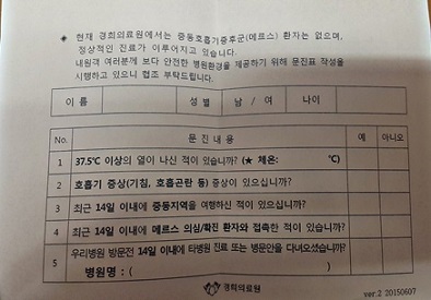 문진표는 ▲37.5도 이상 발열 여부 ▲호흡기 증상(기침·호흡곤란 등) ▲최근 14일 이내 중동지역 방문 ▲14일 이내 메르스 의심 또는 확진 환자 접촉 ▲14일 이내에 타병원 진료 혹은 병문안 여부 등을 묻는 질문사항이 담겼다.