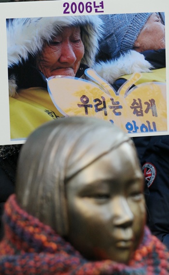 | ▲ 주한 일본대사관앞에 설치된 위안부상,/사진=연합뉴스 |