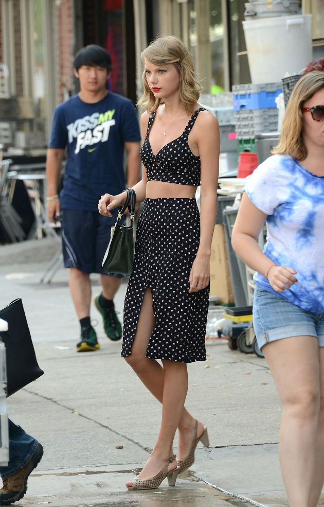 테일러 스위프트는 사진 속에서 검은색 바탕에 하얀 동그라미가 박힌 원피스를 입고 도도한 표정을 지으며걸어가고 있다. 그녀의 늘씬하고 볼륨있는 몸매가 시선을 주변사람들의 시선을 사로잡고 있다.