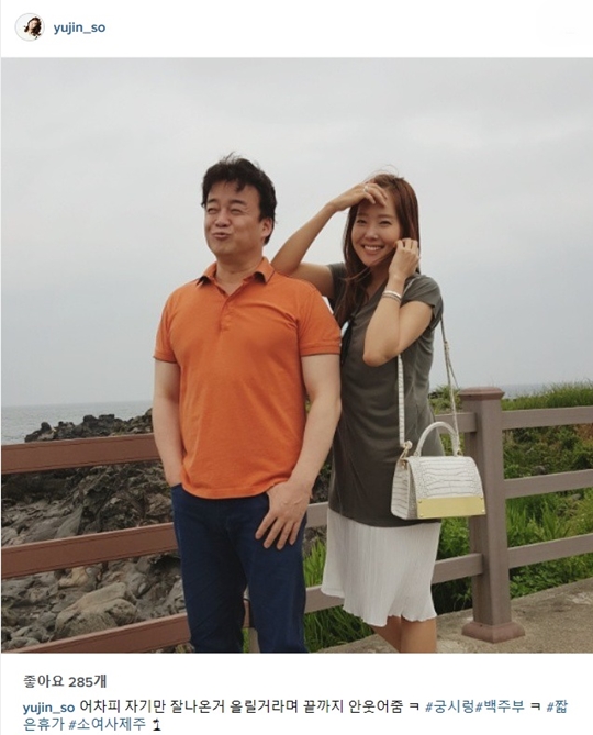 소유진은 지난 23일 자신의 인스타그램을 통해 "어차피 자기만 잘나온거 올릴거라며 끝까지 안 웃어줌 궁시렁 백주부. 짧은 휴가. 소여사 제주"라는 글과 함께 사진 한 장을 올렸다.