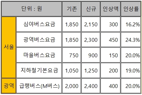 서울지역 심야버스 요금은 1850원에서 2150원으로 300원 오른다. 광역버스 요금은 1850원에서 2300원으로 450원 인상된다. 마을버스 요금은 150원 오른 900원으로 결정됐다.
