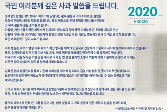 이기병 평택성모병원 원장은 "평택성모병원에서 메르스에 감염되신 분들과 격리조치로 큰 불편을 겪으신 분들께 다시 한번 사과드리며 메르스로 인해 유명을 달리하신 분들과 그 유족들에게도 깊은 조의를 표한다"며 "전국에서 감염병에 가장 안전한 병원으로 거듭났다고 자부한다"고 말했다.