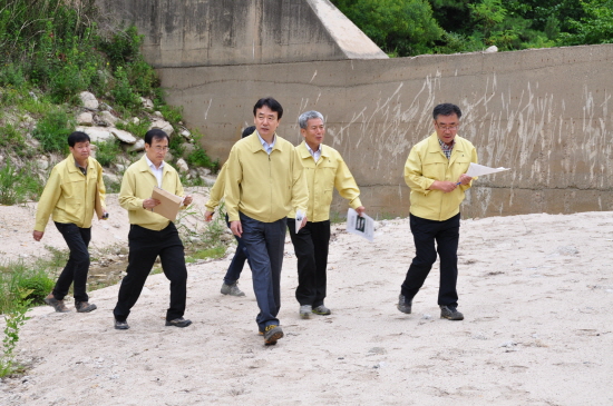 [미디어펜=온라인뉴스팀] 본격 장마철을 맞아 산림청 김용하 차장(왼쪽 세번째)이 7일 강원도 화천군 간동면 간척리 사방댐 현장을 방문, 시설물을 점검하고 있다. 김용하 차장은 "사방댐 유지·관리에 철저를 기해 달라며, 사방댐 준설의 필요성 여부를 사업목적에 따라 잘 구분해 준설이 필요한 지역은 우기 전 준설을 완료해 달라"고 당부했다.