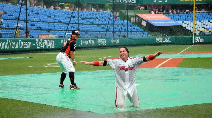 우천으로 인한 경기 취소가 확정되면 선수들은 그라운드에 놓여진 방수포로 뛰어들어 슬라이딩을 하는 '우천 세레모니'를 선보인다. 경기장을 찾아온 팬들의 아쉬움을 달래주기 위한 작은 행사다.