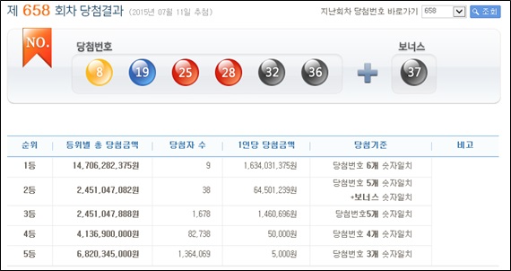11일 나눔로또에 따르면 제658회차 당첨번호는 8, 19, 25, 28, 32, 36이였으며 보너스번호는 37번이였다.
