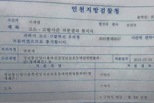 인천지검 공안부(최성필 부장검사)는 정보통신망이용촉진 및 정보보호 등에 관한 법률상 명예훼손과 모욕 혐의로 변 대표를 벌금 300만원에 약식기소했다고 12일 밝혔다.