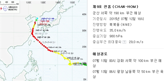 태풍 찬홈은 이날 오후 6시 현재 군산 서쪽 약 190㎞ 부근 해상에서 시속 35㎞ 속도로 북북동진하고 있다.