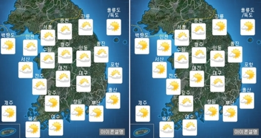 | ▲ 14일 전국 오전(왼쪽)과 오후 날씨./기상청 |