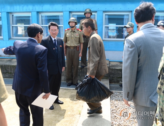 [미디어펜=김소정 기자]울릉도 근해에서 표류하다 구조돼 북으로 돌아가기를 희망한 2명이 14일 판문점을 통해 북 측에 송환됐다.