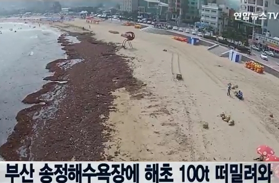 | ▲ 해운대구는 14일 송정해수욕장 백사장에 해초가 밀려 와 죽도공원에서 300m 구간에 입욕금지 조치를 내렸다고 한다. 해운대구는 제9호 태풍 찬홈이 지나면서 수중에 있던 해초가 해안가로 밀려온 것으로 추정하고 있다. 밀려온 해초의 양은 100t에 달한다. /사진=연합뉴스TV 영상캡처 |