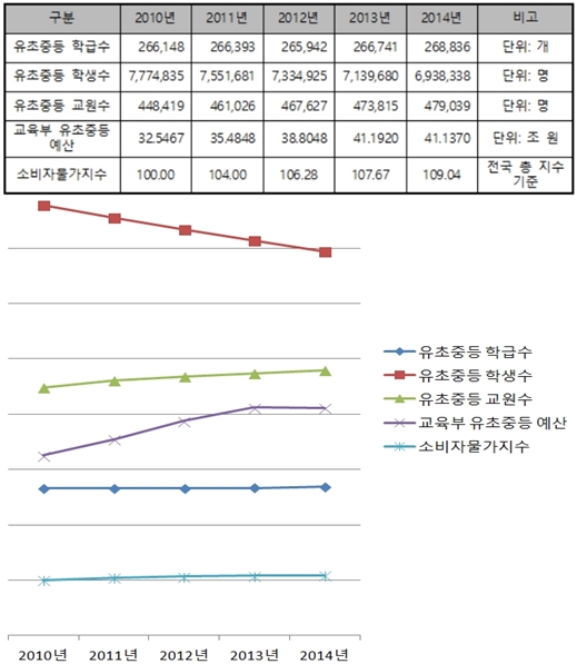 ▲ 2010~2014년 유초중등 통계 증감 추이. /제작: 미디어펜, 자료 참조: 교육통계서비스(http://kess.kedi.re.kr/index), 한국은행 경제통계시스템(https://ecos.bok.or.kr/) |