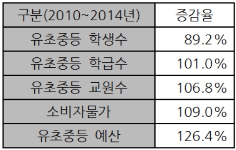 2010년부터 2014년에 이르기까지 지난 4년간 유초중등 교육에 종사하는 교원수는 6.8% 늘었다. 그와 반비례하여 학생 수는 10.8% 줄었다. 유초중등 분야의 예산 증감율은 더욱 놀랄 노자다. 지난 4년간 26.4% 늘었다. 소비자물가는 9% 증가에 그쳤는데 말이다. 학생수는 열에서 아홉으로 줄었지만 예산은 넷에서 다섯으로 늘어났다. 그 증가폭은 소비자물가의 3배에 달한다.