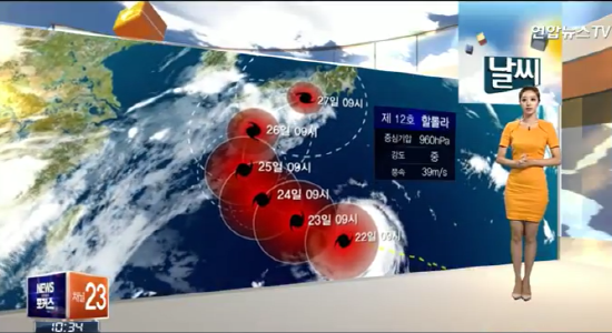 기상청은 제12호 태풍 ´할롤라(HALOLA)´는 현재 일본 큐슈 서쪽을 지나 대한해협으로 빠져 나갈 것으로 예상돼 토요일인 25일부터 남해상에서 물결이 매우 높게 일겠다. 제주도와 남부 일부 지방은 태풍의 영향을 받을 것으로 예상돼 피해에 철저한 대비를 당부했다.
