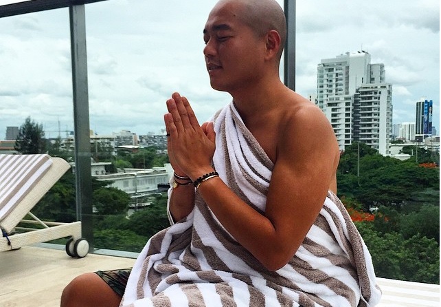 정창욱은 사진 속에서 오른쪽 가슴을 살짝 드러내고 두손을 모은 동작을 취하고 있다.